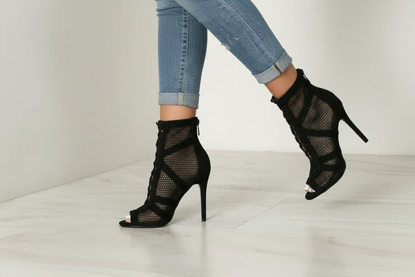 Turn heads with the Lace Cross-Tied Peep Toe Heels, designed for fashion-forward looks and confident steps. These ankle-strap sandals combine a sleek super-high heel with a cross-tied lace-up detail for a feminine and glamorous finish.