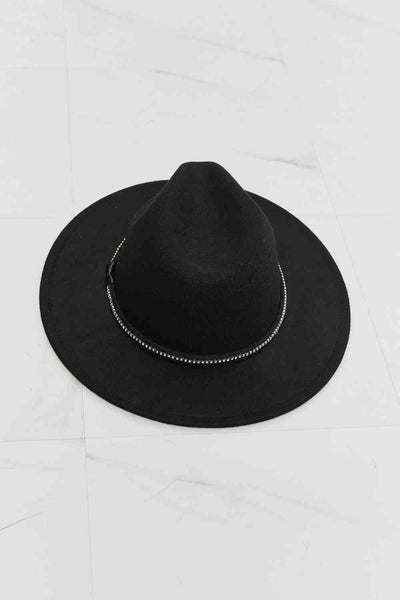 This hat is the perfect accessory for any occasion, adding a touch of sophistication and glamour to any outfit. This hat features a classic fedora shape with a wide brim, providing both style and practicality. The black color of the hat is versatile and can easily match with any outfit, while the mini rhinestone detailing adds a subtle yet beautiful touch of sparkle.