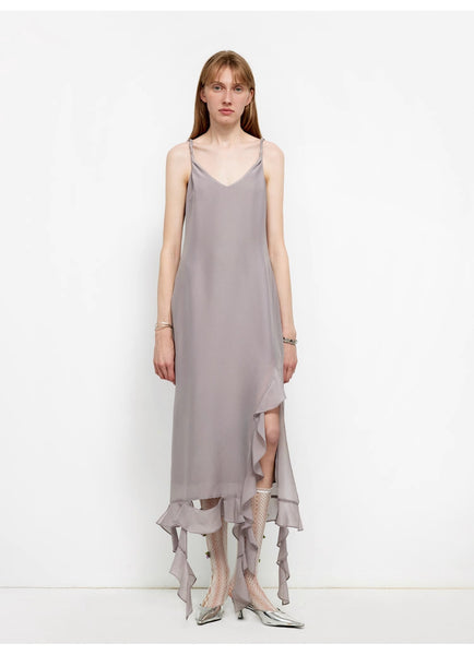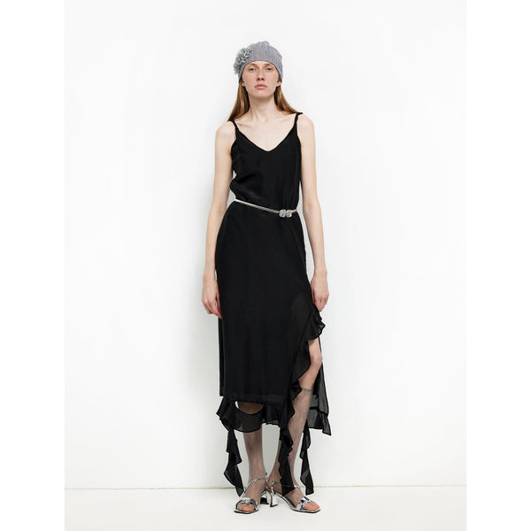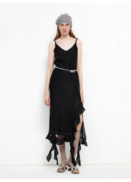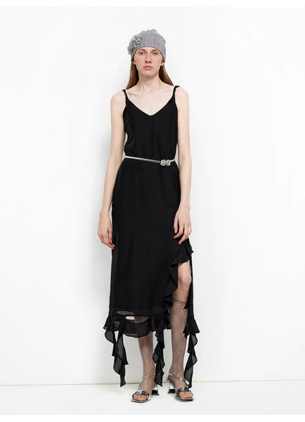 The straight skirt with a slightly A-line hem has a slimming effect and strong inclusiveness. It perfectly contours the body and refines the long, slender lines of the legs. The frayed and dangling ruffled design at the hem looks lively and natural. The vintage small heart-shaped collar has a softer curve than the traditional V-neck, skillfully adjusting the skin exposure and elongating the neckline.
