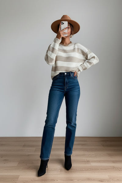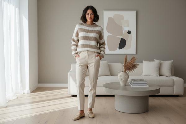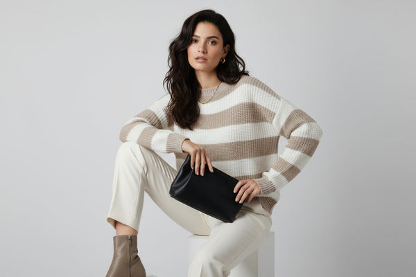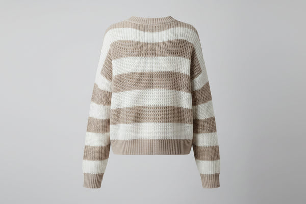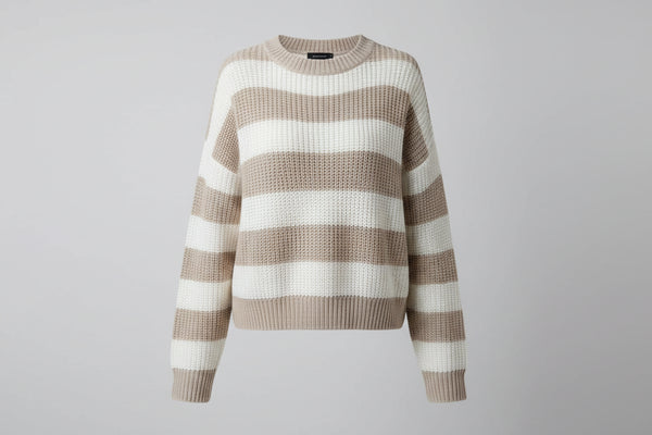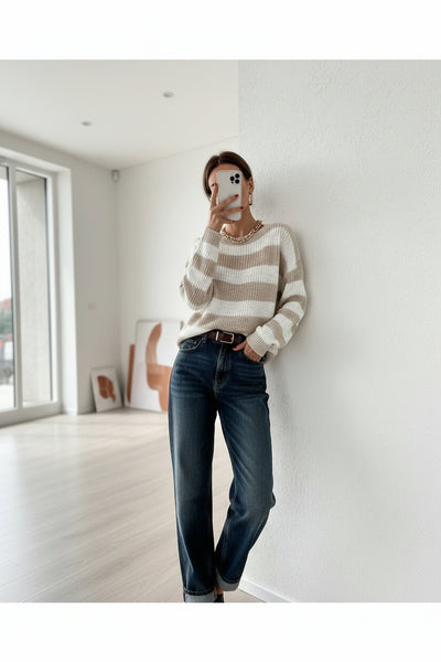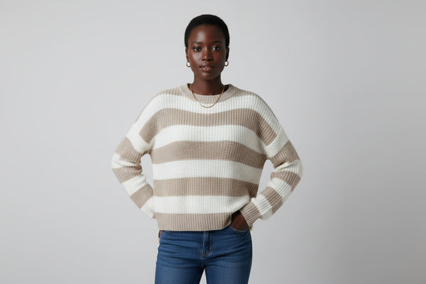 This striped knit pullover exemplifies the power of considered design. Crafted from luxuriously soft knit fabric, it features a refined horizontal stripe pattern that adds subtle visual intrigue without sacrificing versatility. The generously cut silhouette accommodates various body types while maintaining a polished appearance, and the classic crew neckline ensures effortless coordination with your existing pieces. A sophisticated staple that transcends seasonal trends.