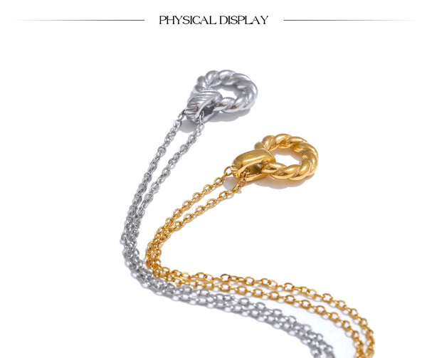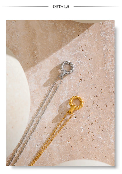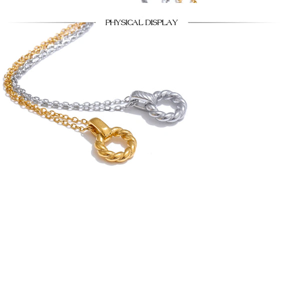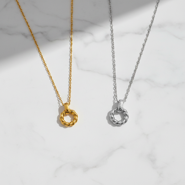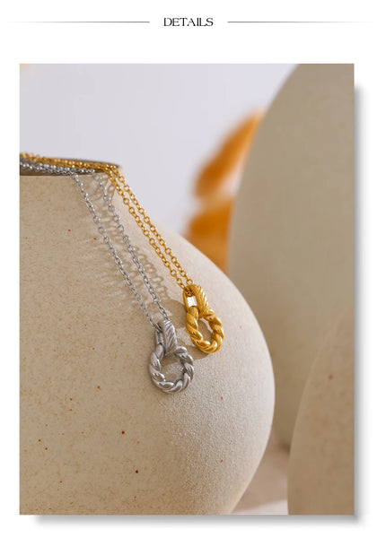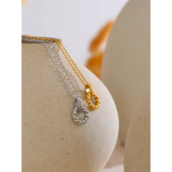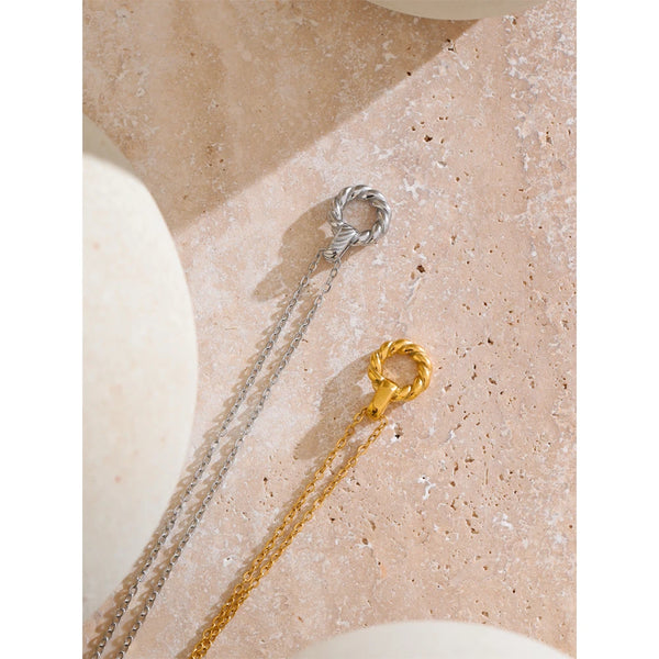 This Twisted Rope Circle Pendant Necklace is the kind of piece that looks quietly expensive. A chunky twisted rope formed into a perfect circle, suspended from a delicate cable chain — available in rich 18K PVD gold or cool high-polish silver. It's the necklace you reach for every single morning without thinking twice.